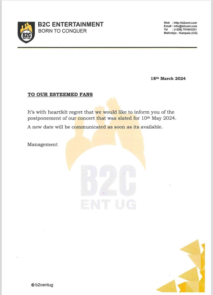 The post B2C Postpones Highly Anticipated 2024 Concert appeared first on BigEye.UG.